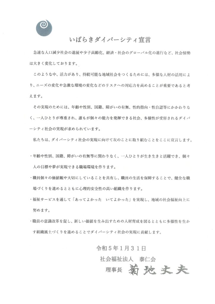 社会福祉法人泰仁会では茨城県が取り組む「いばらきダイバーシティ宣言」に登録し宣言を行いました。