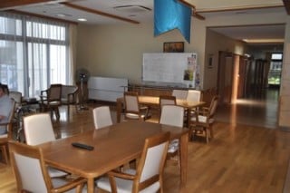 地域との交流場所をコンセプトに開放的な作りとなっております。また、談話室と談話スペースが隣り合わせなので、ご利用者と職員の距離も近く会話を楽しみながら食事を待つこともできます。